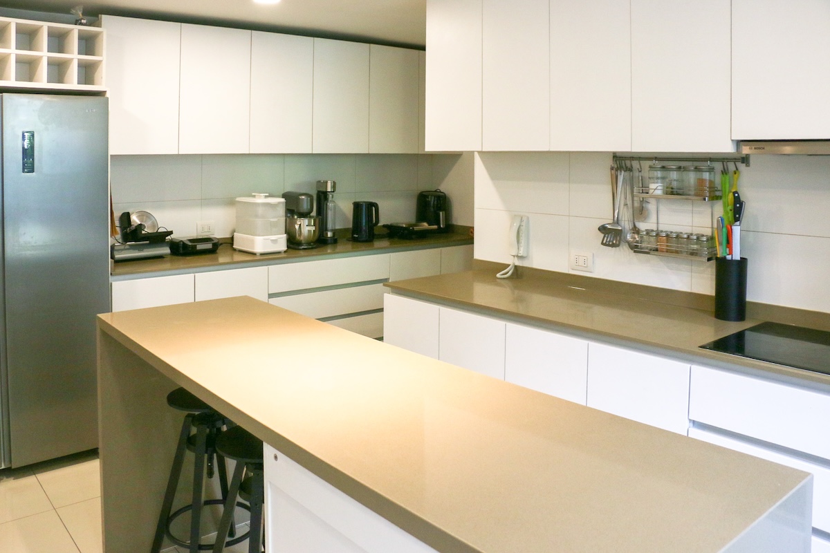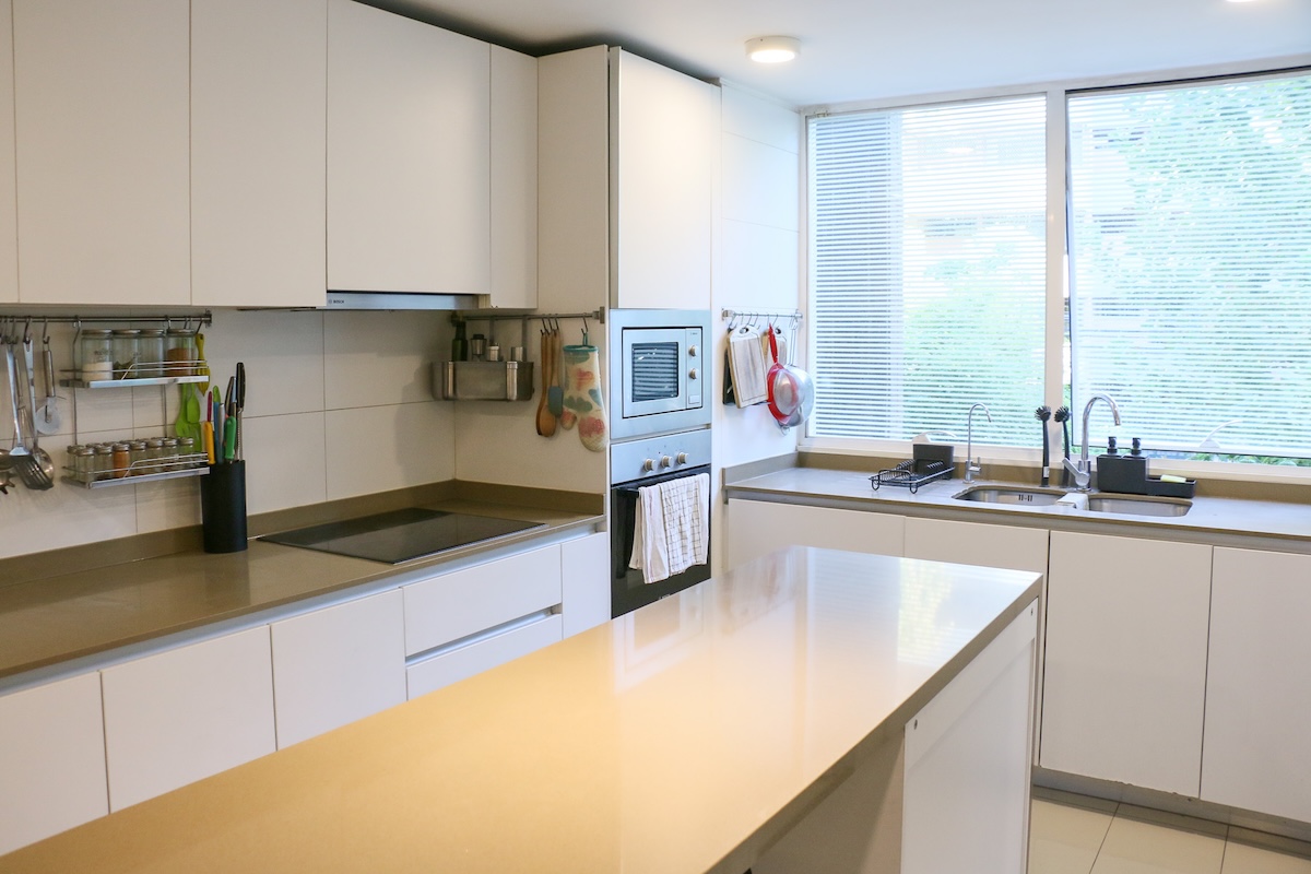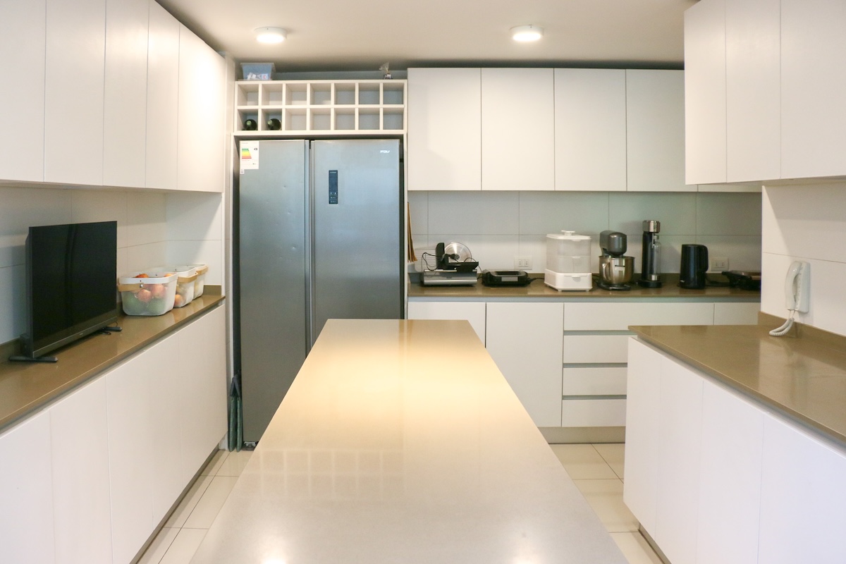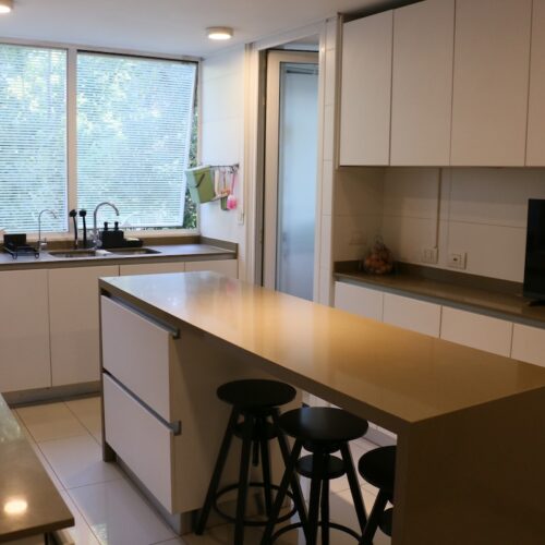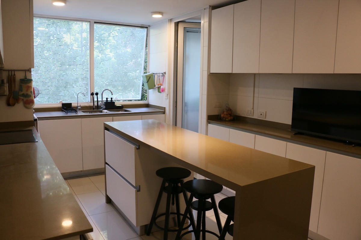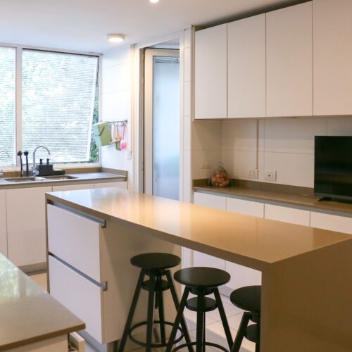 Luego tenemos la cocina, separada del comedor. Aquí deseamos la calidad del mobiliario, la comodidad del mesón isla central y la cantidad de espacio para guardar, ademas de la exquisita iluminación natural que recibe.