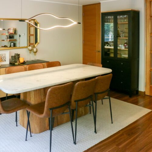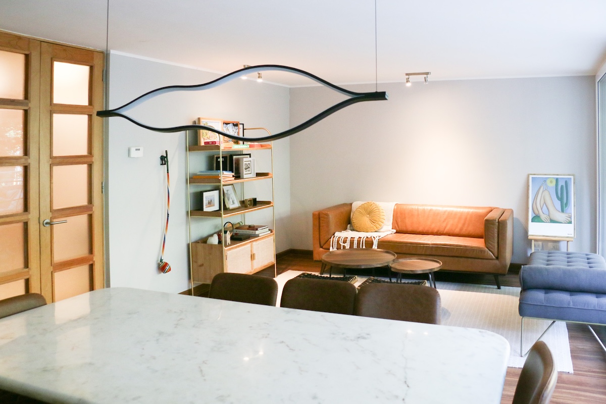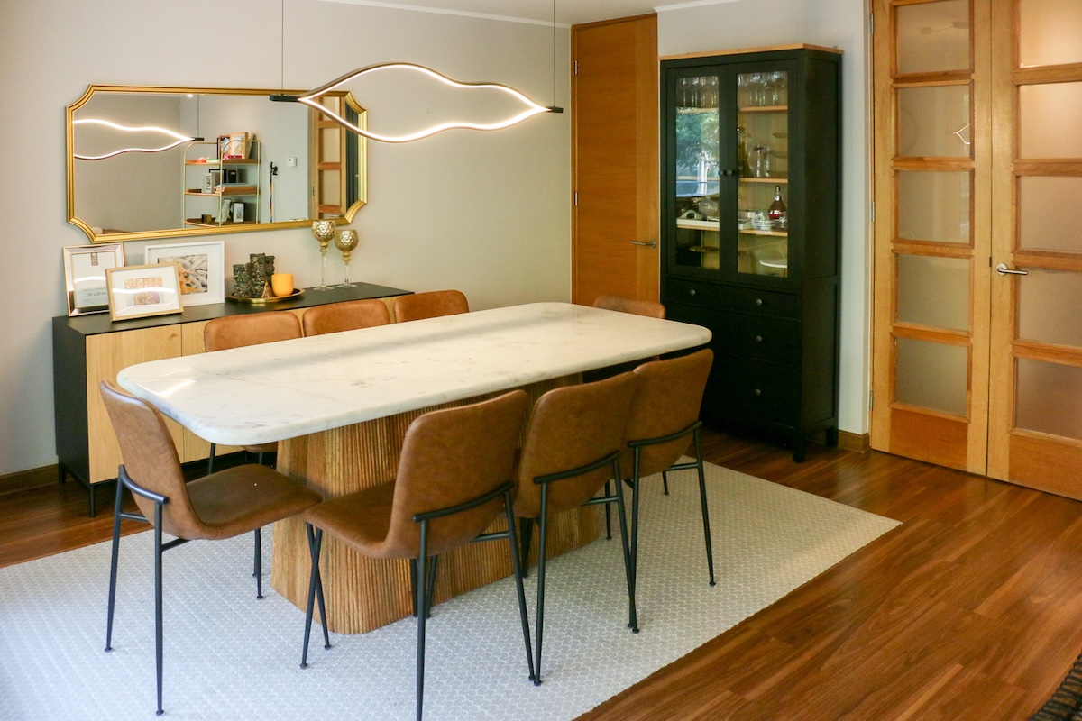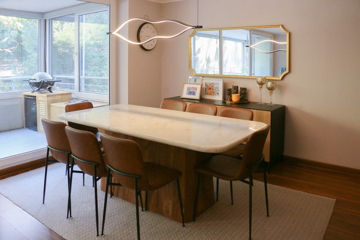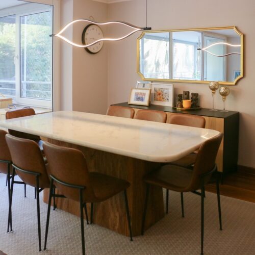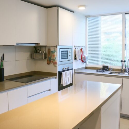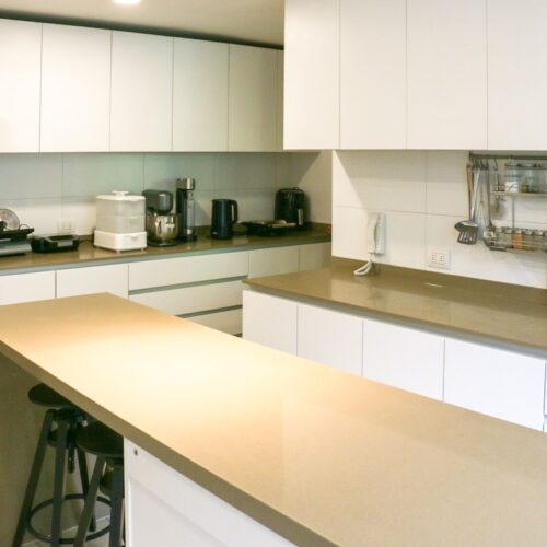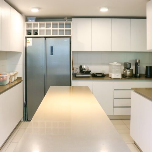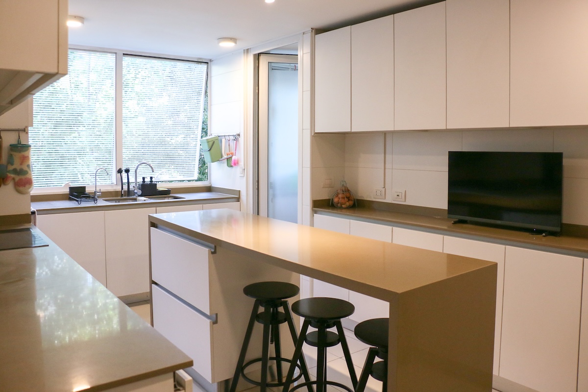 Luego tenemos la cocina, separada del comedor. Aquí deseamos la calidad del mobiliario, la comodidad del mesón isla central y la cantidad de espacio para guardar, ademas de la exquisita iluminación natural que recibe.