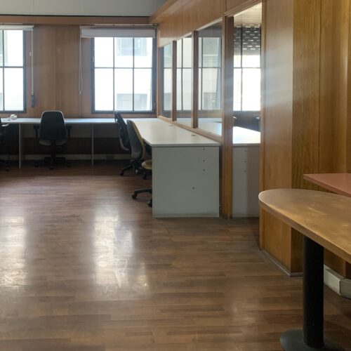 Hacia la derecha, otro espacio de trabajo con escritorios a la redonda y muebles, separado del espacio central por una puerta pero visualmente conectado a la sala principal, puesto que está dividido por mamparas de vidrio transparente.